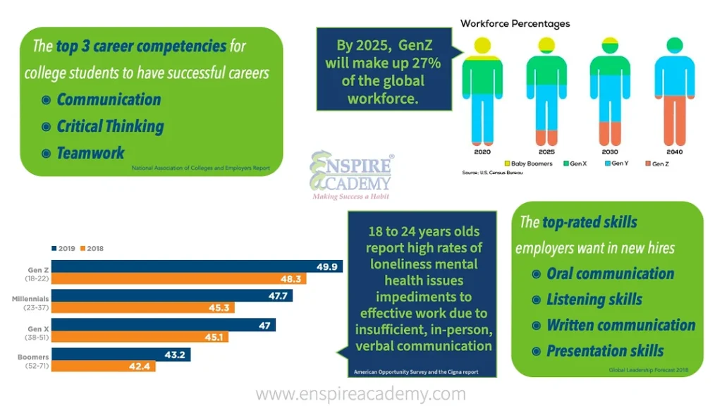 By 2025, GenZ will make up 27% of the workforce. The latest American Opportunity Survey and the Cigna report show that 18 to 24 years olds report high rates of loneliness, mental health issues, impediments to effective work, and worries about the future. What is the cause of these high percentages? The soft skills gap. With technological advancements in communications, Genz prefers technology over in-person communication which deprives them of opportunities to communicate their ideas, feelings, and beliefs verbally. This weakens their ability to develop conversational skills and maintain strong interpersonal relationships, a critical component of career success.